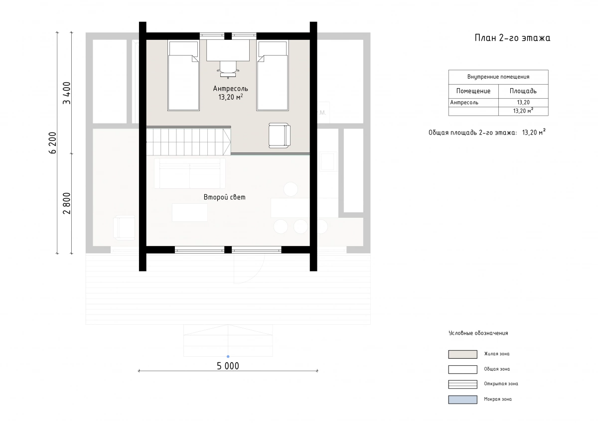 Второй этаж выполнен в формате антресоли (13 м²), что делает пространство максимально удобным для размещения зоны отдыха или спального места. Благодаря концепции второго света, баня наполнена естественным светом и визуально кажется еще просторнее.