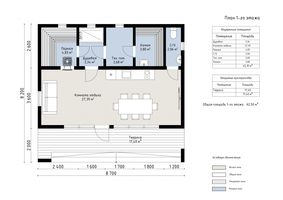 Современный стиль подчеркнут лаконичным дизайном и панорамными окнами, наполняющими помещения светом. Просторная гостиная площадью 27 м² станет отличным местом для отдыха и встреч с близкими. Внутренние помещения занимают 45 м²: гостиная, хамам, парная, душевая, техпомещение и санузел. Просторная терраса площадью 18 м² идеально подойдет для отдыха на свежем воздухе и уютных вечеров. «Осака» — выбор для тех, кто ценит стиль, комфорт и функциональность.