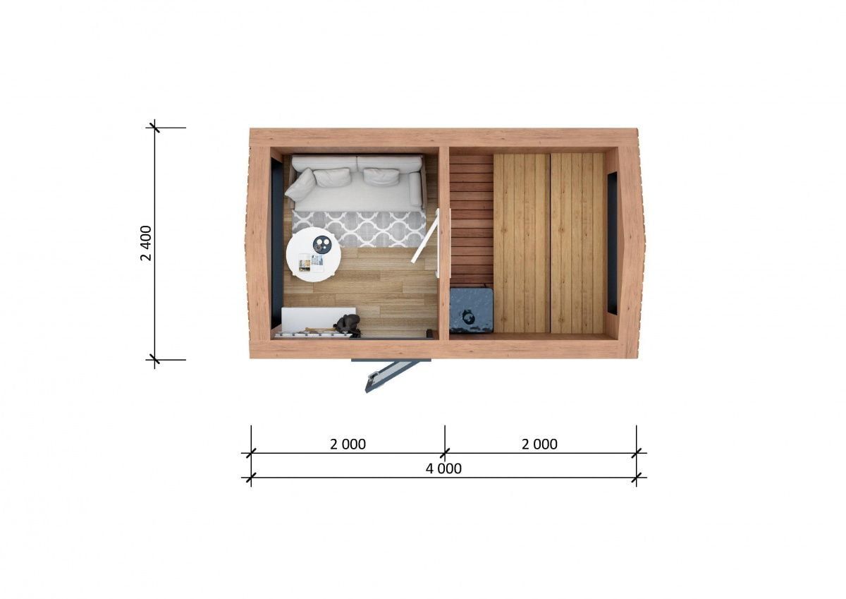 Проект выполнен в модульной технологии, что обеспечивает быструю установку и долговечность конструкции. Дизайн сочетает минимализм и функциональность, а панорамное остекление делает пространство светлым и уютным. Планировка включает просторную гостиную (5 м²), которая может служить зоной отдыха, и парную (5 м²) с дровяной печью, обеспечивающую комфортные условия для банных процедур. Высокие потолки и лаконичный интерьер создают ощущение простора, а использование натуральных материалов делает атмосферу приятной. Баня подходит для дачных участков и загородных домов, предлагая комфортное пространство для отдыха. Благодаря компактным размерам (4×2,4 м) ее можно разместить даже на небольшом участке, а мобильность позволяет легко транспортировать и устанавливать в любом удобном месте.