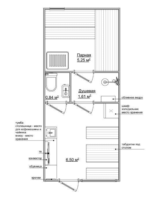 Баня имеет компактные размеры 7×3 метра, что делает её подходящей как для дачного участка, так и для небольшого загородного дома. Внутри проект включает несколько функциональных зон: просторную парную площадью 5,25 м², душевую зону площадью 1,6 м² и туалет с местом для хранения. Просторная комната отдыха площадью 6,5 м² выполнена с учетом комфорта и удобства, идеально подходя для приятного времяпрепровождения с семьей и друзьями.