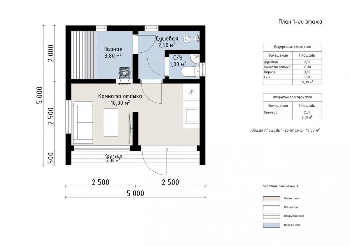 Внутреннее пространство включает комнату отдыха (10 м²), где можно расслабиться после банных процедур. Удобная парная (4 м²) с продуманной компоновкой обеспечивает комфортный отдых, а рядом расположенные душевая (2,5 м²) и санузел (1 м²) повышают функциональность бани.