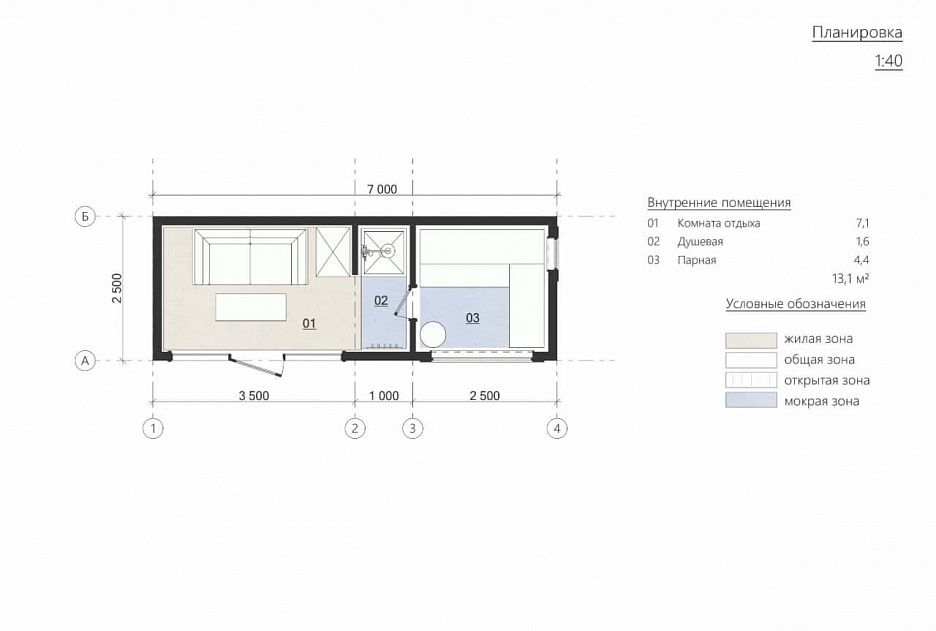 Каркасная конструкция из натурального дерева позволяет возвести эту баню всего за 1–3 дня, обеспечивая комфортное пространство для отдыха. Площадь помещений составляет 13 м², что делает её удобной для семьи или небольшой компании друзей. Планировка включает в себя просторную комнату отдыха (7,1 м²), душевую с раздевалкой (1,6 м²) и вместительную парную (4,4 м²). Модульный формат 7×2,5 м обеспечивает оптимальное соотношение площади и удобства размещения на участке. Каркасная технология гарантирует энергоэффективность, надёжность и доступность без потери качества. Box 02 станет отличным выбором для тех, кто не хочет тратить месяцы на строительство. Проект легко впишется в любой ландшафт — от дачного участка до лесной зоны, создавая уютное место для круглогодичного отдыха.-