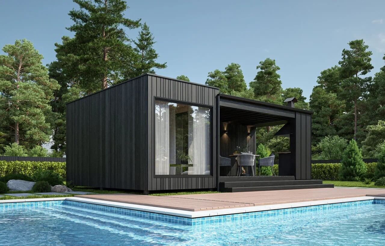 Компактная и стильная модульная каркасная баня "Lounge 01" сочетает в себе современный минималистичный дизайн, функциональность и удобство.