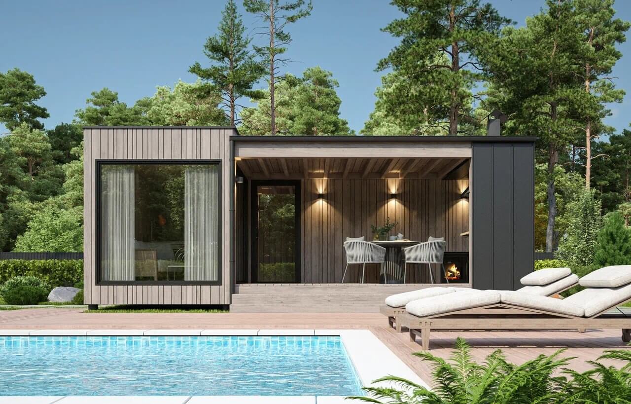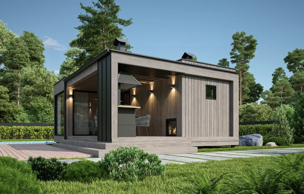 Стильный фасад выполнен из дерева по модульной технологии с панорамным окном, которое обеспечивает максимум естественного света и создает визуальную связь с природой. Ключевой особенностью проекта является закрытая терраса площадью 10,8 м² с навесом, где можно организовать защищённую зону отдыха на свежем воздухе круглый год. Внутренние помещения занимают 25,2 м² и включают уютную комнату отдыха (5,6 м²), функциональную кухню (6 м²), просторную парную (5,1 м²), а также компактную душевую (1,1 м²). Двухмодульная конструкция и современные технологии строительства обеспечивают быструю установку за 1–3 дня, долговечность и комфорт. Баня «Lounge 03» идеально подойдет для тех, кто ищет гармонию современного стиля, функциональности и круглогодичного использования на компактном участке. Она станет прекрасным выбором для семейных встреч или отдыха в кругу друзей с возможностью комфортного времяпрепровождения независимо от погодных условий.- Бани под ключ