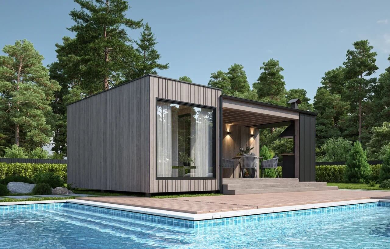 Модульная каркасная баня «Lounge 03» площадью 36 м² сочетает современный минималистичный дизайн и практичность.