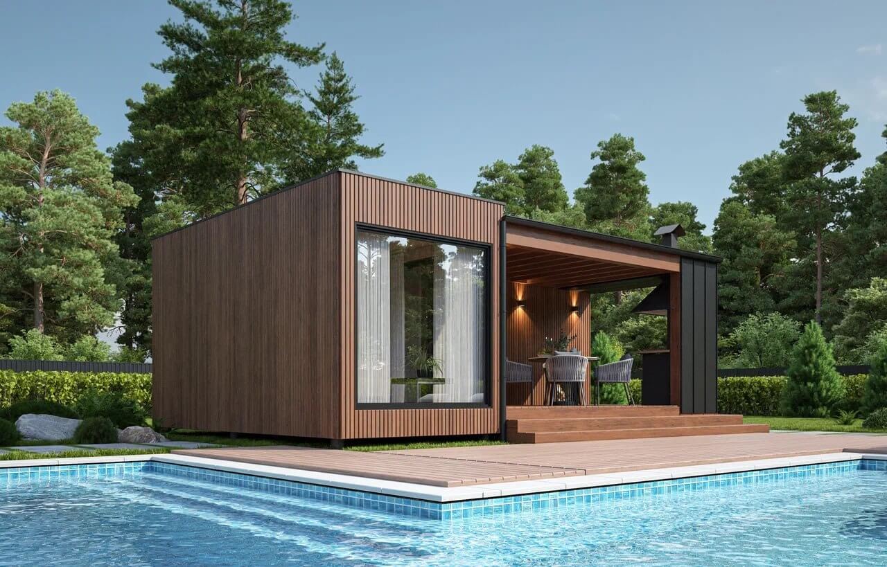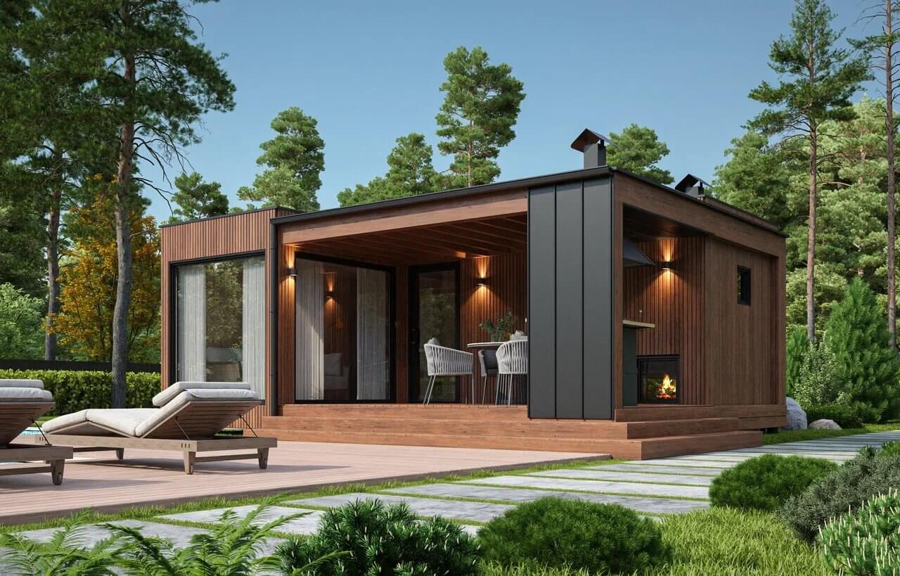 Благодаря удачной архитектуре и продуманной модульной планировке, баня гармонично вписывается в любой природный ландшафт и легко адаптируется под индивидуальные задачи заказчика. В основе проекта — деревянный каркас, оформленный в минималистичном стиле: лаконичные формы, натуральные материалы, панорамное остекление и просторная закрытая терраса с навесом. Общая площадь составляет 42 м², что делает баню вместительной для компаний до 6-8 человек, но при этом компактной для размещения на среднем по размеру участке. Планировка включает: просторную парную (5,1 м²) с возможностью установки дровяной или электрической печи, компактную душевую (1 м²), отдельный санузел (1 м²), а также уютную комнату отдыха (5,6 м²) и полноценную кухню (7,3 м²). Благодаря такому зонированию баня может использоваться не только для банных процедур, но и как гостевой дом или место для семейных встреч. Большое панорамное окно создает визуальную связь с природой и наполняет помещения естественным светом, а продуманное освещение делает пространство комфортным в любое время суток. Ключевой особенностью является закрытая терраса площадью 13,8 м² с навесом, защищающая от непогоды и позволяющая организовать круглогодичную зону отдыха, барбекю или установку купели. Двухмодульная конструкция обеспечивает быструю установку за 1–3 дня без сложных строительных работ. Проект особенно подойдет для тех, кто планирует круглогодичное использование: зимой можно париться в уютной теплой парной, а летом и в межсезонье проводить вечера на защищённой террасе в кругу семьи или друзей. Lounge 04 — это отличное решение как для частного загородного участка, так и для коммерческого размещения в глэмпинг-парках, базах отдыха и туристических комплексах.- Бани под ключ