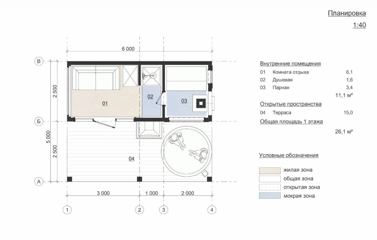 Конструкция размером 6×5 метров объединяет традиционное банное пространство и защищённую от непогоды веранду на общей площади 30 м². Каркасная технология обеспечивает экологичность, энергоэффективность и установку всего за 1–3 дня. Архитектура в стиле минимализм подчёркнута строгими линиями, окном для естественного освещения и деревянной отделкой фасада, что делает баню органичной частью загородного ландшафта. Планировка включает четыре функциональные зоны: уютную комнату отдыха (6,1 м²), компактную душевую с раздевалкой (1,6 м²), парную (3,4 м²) и просторную закрытую террасу (15 м²). Эта терраса становится универсальным пространством для круглогодичного использования — здесь можно разместить обеденную зону, лаунж с мягкой мебелью или место для утреннего чаепития, защищённое от осадков и солнца. Благодаря продуманной организации пространства проект подходит как для семейного отдыха, так и для приёма гостей. Panorama 02 идеальна для владельцев загородных участков в регионах с переменчивым климатом, ценителей современной архитектуры и тех, кто рассматривает коммерческое использование — для посуточной аренды или размещения в глэмпинг-комплексах, где важна всесезонная функциональность и защищённое пространство для отдыха.